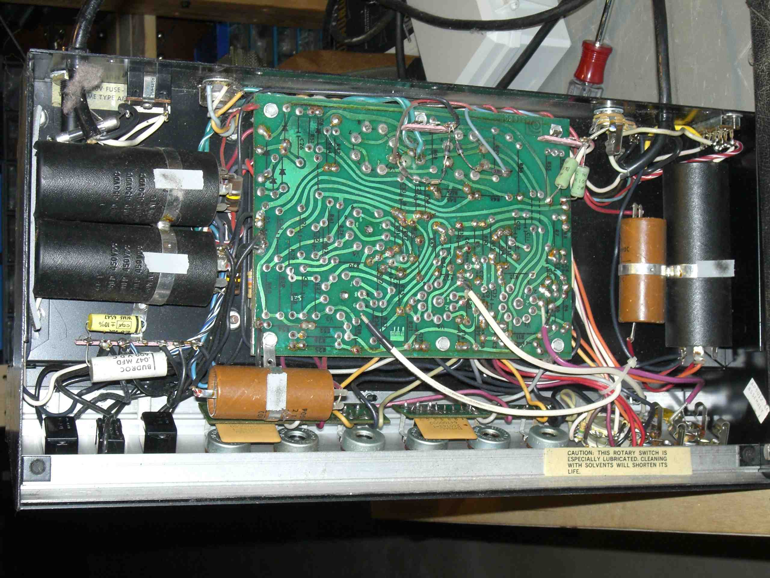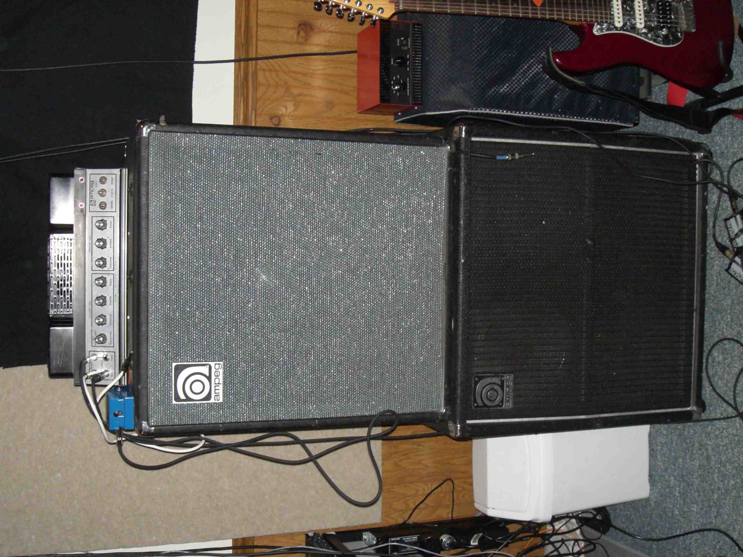 This amp has a history, most of which I know nothing about. But this is one of those stories that makes legends, eventually. It goes like this… it used to live at a Theater (as in stage play theater..) for probably the major portion of it’s life, and one day it almost hit the dumpster during a cleaning-up operation as the management underwent some changes. Luckily for me a good friend spotted it as it was literally being carried out and detoured the folks carrying it towards his van. It was gifted to me and aside from being a little scratched up, it’s in fine shape after minimal servicing. It even has an original set of USA 7027’s in it, which measure fine. They make 70-80 watts RMS clean. As the Altec 15″ (original, it appears) speaker seems pretty efficient, this unit can easily keep up with a drummer and as such it’s the main bass amp in my project studio now. My friend Steve uses it whenever the old band gets together, and we love it’s tone. It sits on an 80’s Ampeg 4×10 cabinet, and the combination of the two can move a lot of air. It also makes a nice looking bass stack. The 4×10 was an eBay local purchase – local,.. OK, Bay City, but that’s still local enough..) where I paid 75 dollars for the cabinet with 1 damaged and theoretically 3 OK speakers. In the end I had two of the drivers reconed, ($70) and had to repair the grille. Overall cost for this stack was about 150 dollars. How’s that for a deal? Like I said… the stuff of Legends… :o)