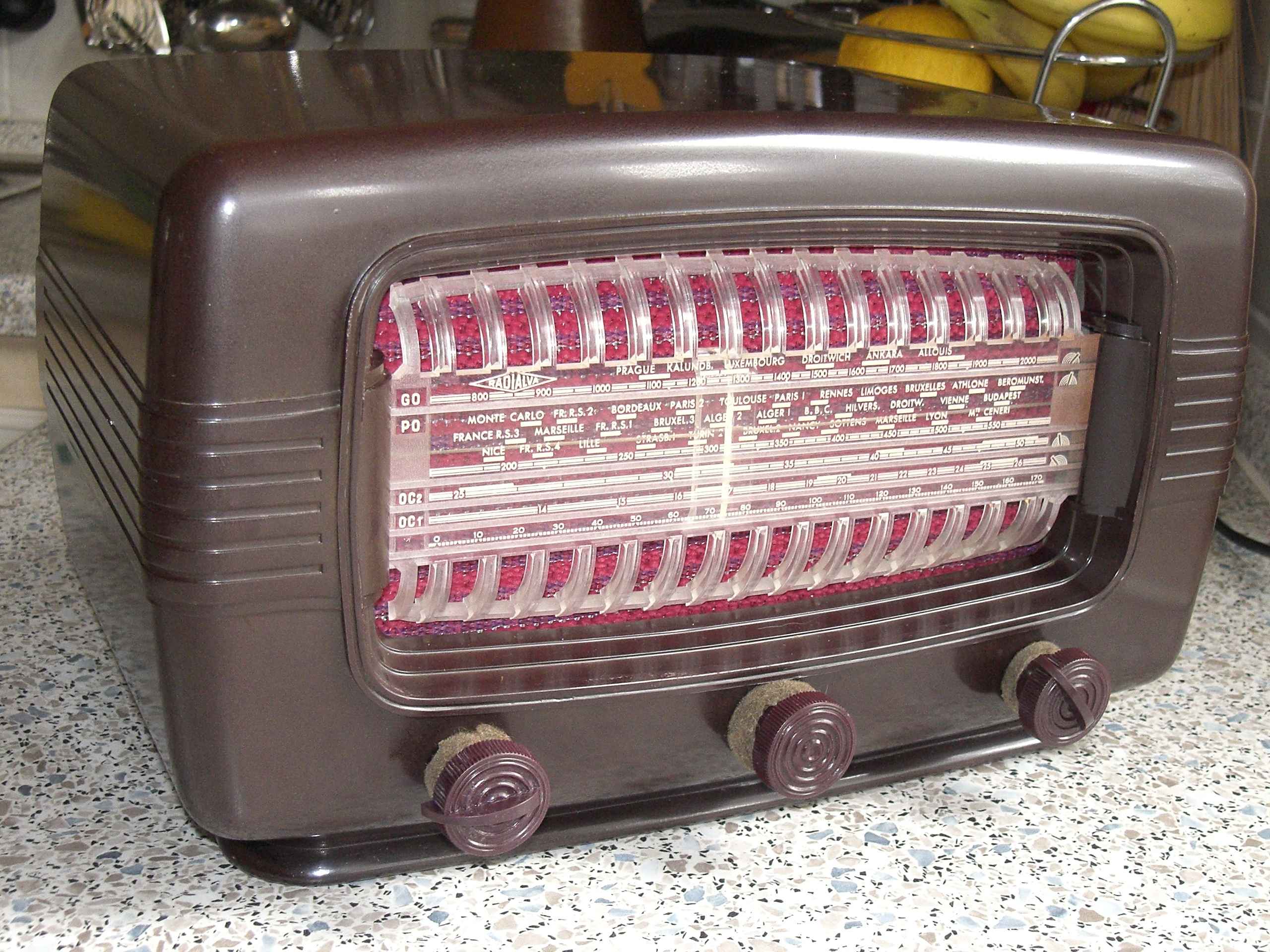 The lamps were both replaced. A mild RF alignment was necessary after all the caps were replaced, to peak things out. This radio has 4 bands, Longwave, Medium Wave (our AM-band), Shortwave 1 and Shortwave 2. The radio is also set up for 220v/120v operation, but I really wonder how many of these radios ever hit the American market. You can see in the above picture a little brown socket cap to the near right with a tiny grip on it, and if you look closely, you’ll see the red 220 printed on the side facing the camera. One simply removes the socket plug and rotate it 180 degrees to change the mains voltage setting. Also note the chassis was painted glossy brown, and the mounting points to the cabinet were set with brass threaded inserts. I don’t think this was a low-end radio… too much expense was taken on the hardware side…or perhaps they did it all for style and reputation, as Europeans sometimes do. I miss that kind of thinking in some American products. We’ve forgotten all about that here in the last 40 years as cost-driven mass consumerism has become the do-all end-all in most every market we participate in.