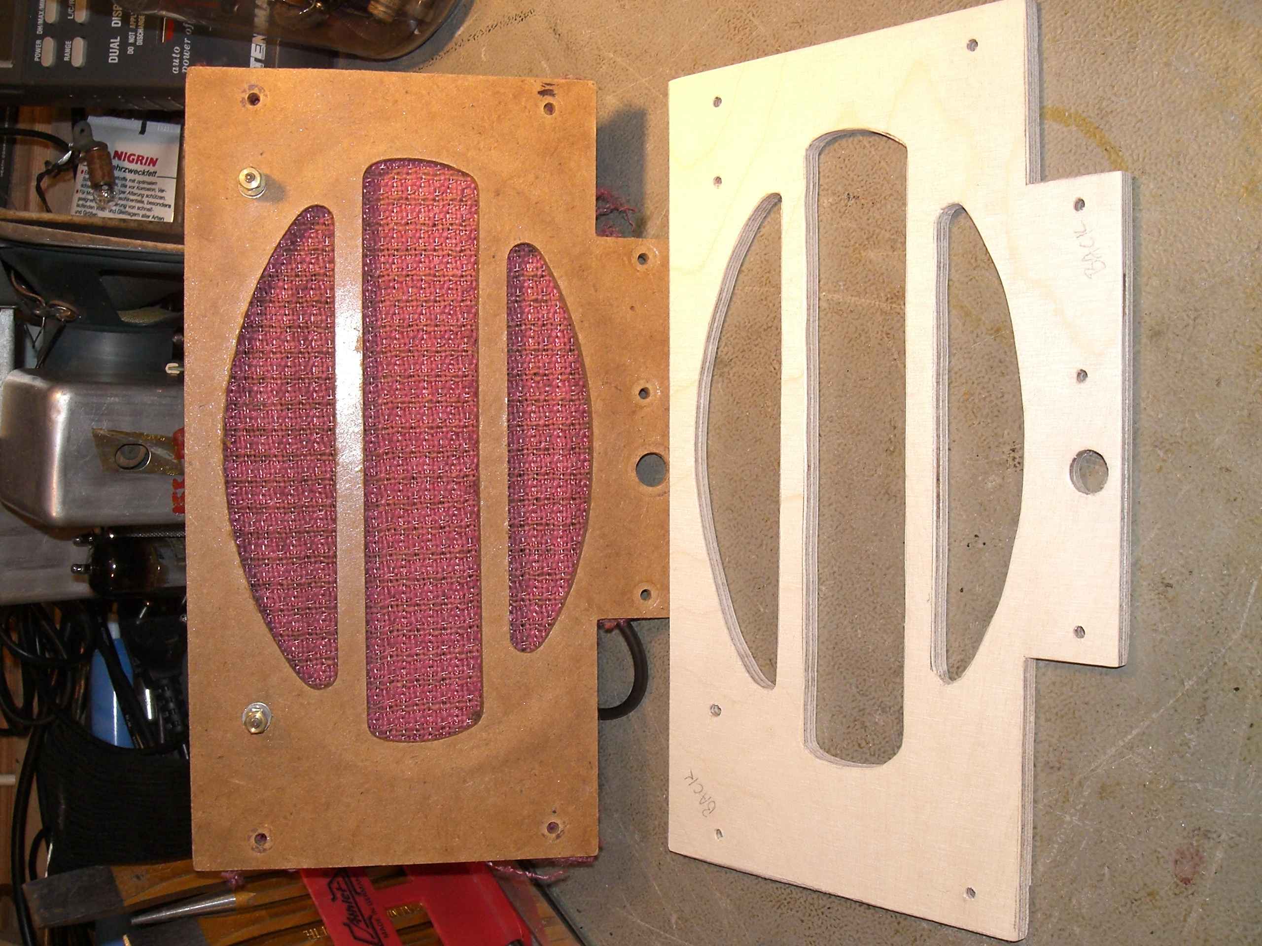 I cleaned the chassis and disassembled the whole front of the radio. This facilitated a better cleaning of the slide-rule dial and illumination setup at the same time. The illumination is particularly neat, and when I saw how it was arranged, I immediately was very glad I bid on the radio, even though I had paid around 85 Euros for it (then about 95 dollars), more than I typically like to drop on a bakelite radio. The illumination can, in my opinion, make or break a radio, and I particularly dislike asymmetrical lighting that you sometimes see when a single lamp is used, mounted off to one side or the other. The Radialva has shielded side sockets designed to “light-pipe” the light across the scale from the left and right sides. A plastic shuttle rides behind the scale on invisible wires and also gets illuminated. The fancy metal socketry keeps light leak to a minimum, to hightenthe effect. Now back to that pesky warped baffle… I removed the old part and was planning on using it for a template to cut a new one or attempting to flatten it somehow. Once apart from the rigid speaker, it was clear that the material was way too flexible to be permanently flattened, and worse, the grill cloth had been glued to the baffle very well. The glue survived better than the cloth, which kind of fell apart when disturbed. Another surprise was waiting behind the baffle. Looking at the back side of the grill cloth, I realized that the color of the cloth had seriously faded from the visible part of the front, but not at all in the back. This turned out well, as I now had a working sample of what I needed to find to put on the new baffle I was going to have to cut, a good sample of the color as well as the weave and texture. Using some 6mm multiplex birch plywood from the local DIY market, I used a scrolling saw to cut a perfect replica of the baffle.