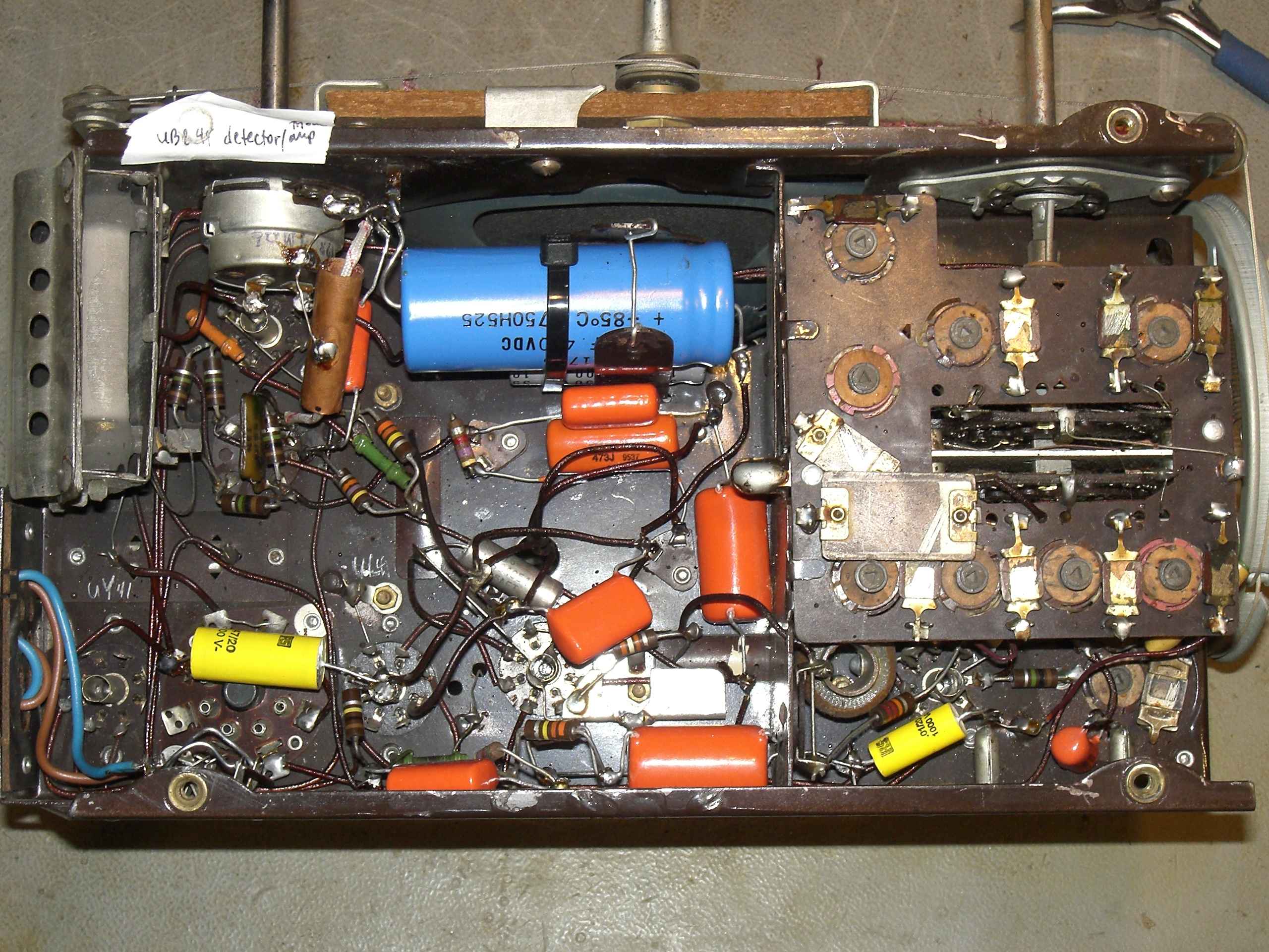 As for the electronics. … I get in this museum- mode sometimes where I feel it’s my duty to make sure a radio will survive functionally for another 50 years. So, all new caps were installed, and an alignment performed after that. Along the way, a full chassis cleaning was in order, as well as lubricating the rotating parts, cleaning the pots and switches, etc.