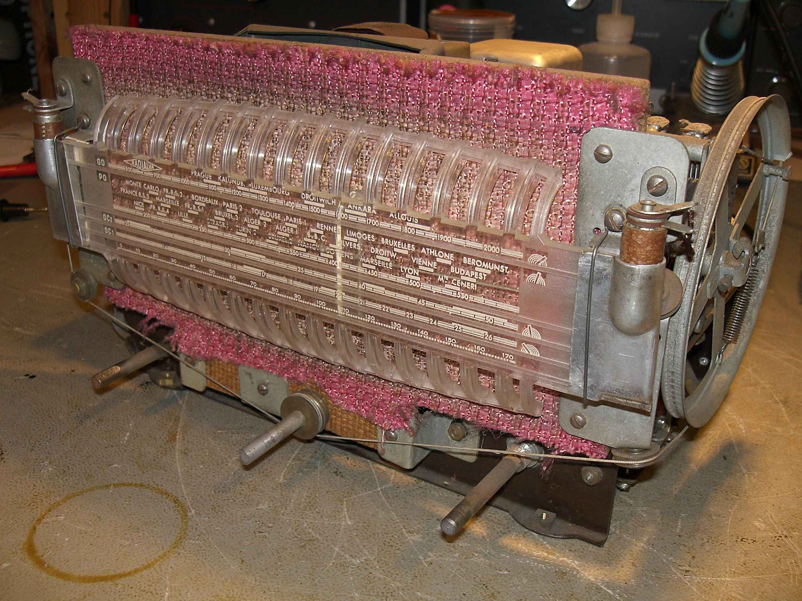 Here is an impulse purchase I made while living abroad in 2006. I saw it on Ebay and just liked the form of the radio. It was in France but it was cross-posted to the German Ebay site. This French-made radio was clearly inspired by the then-still-new rage of television, carrying the CRT shape not only in it’s grill design, but in its cabinet shape as well. Notable is the slide-rule scale and its integration over the speaker, making for a pretty sleek form for 1955. Kind of reminds me today how everything needs to look like a cell phone or an iPod. I wonder if folks in France in 1955 were as tired of that kind of thinking as I and some others are now? Probably not, as consumer electronics were more expensive then and not so pervasive in daily life. But, I digress. The radio dial didn’t move right when the it arrived, and once I got the chassis out it was clear why – the next picture shows the warped speaker baffle made of 5mm masonite. It was clear this had to be repaired or replaced. Apparently the long-term tension of the dial string arrangement was to blame.